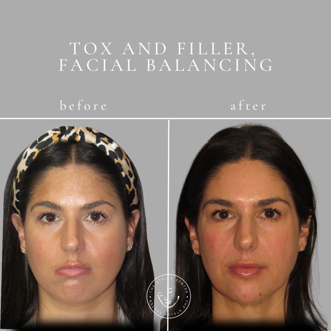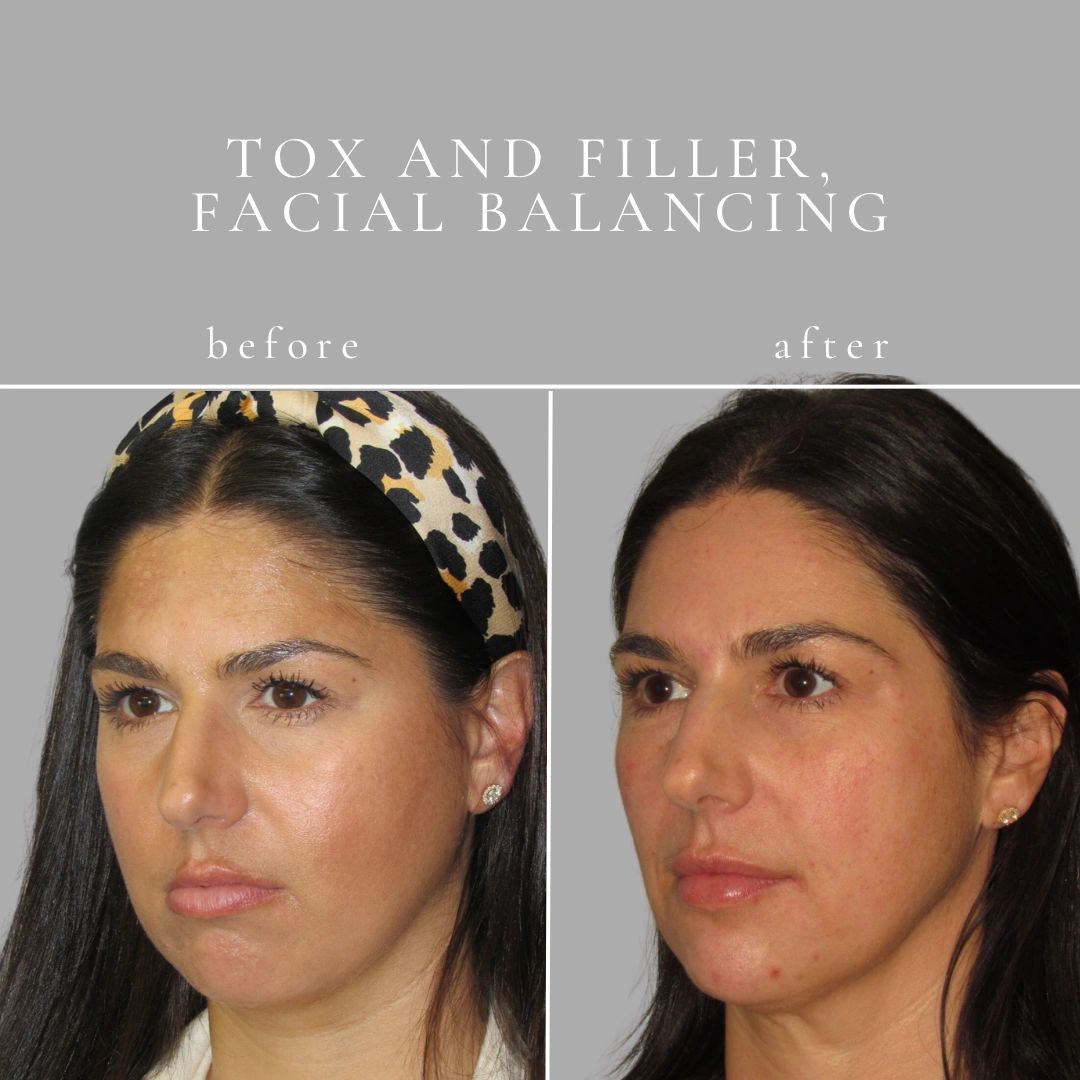 Woman with facial contour improvement after under eye and cheek filler and lower blepharoplasty surg